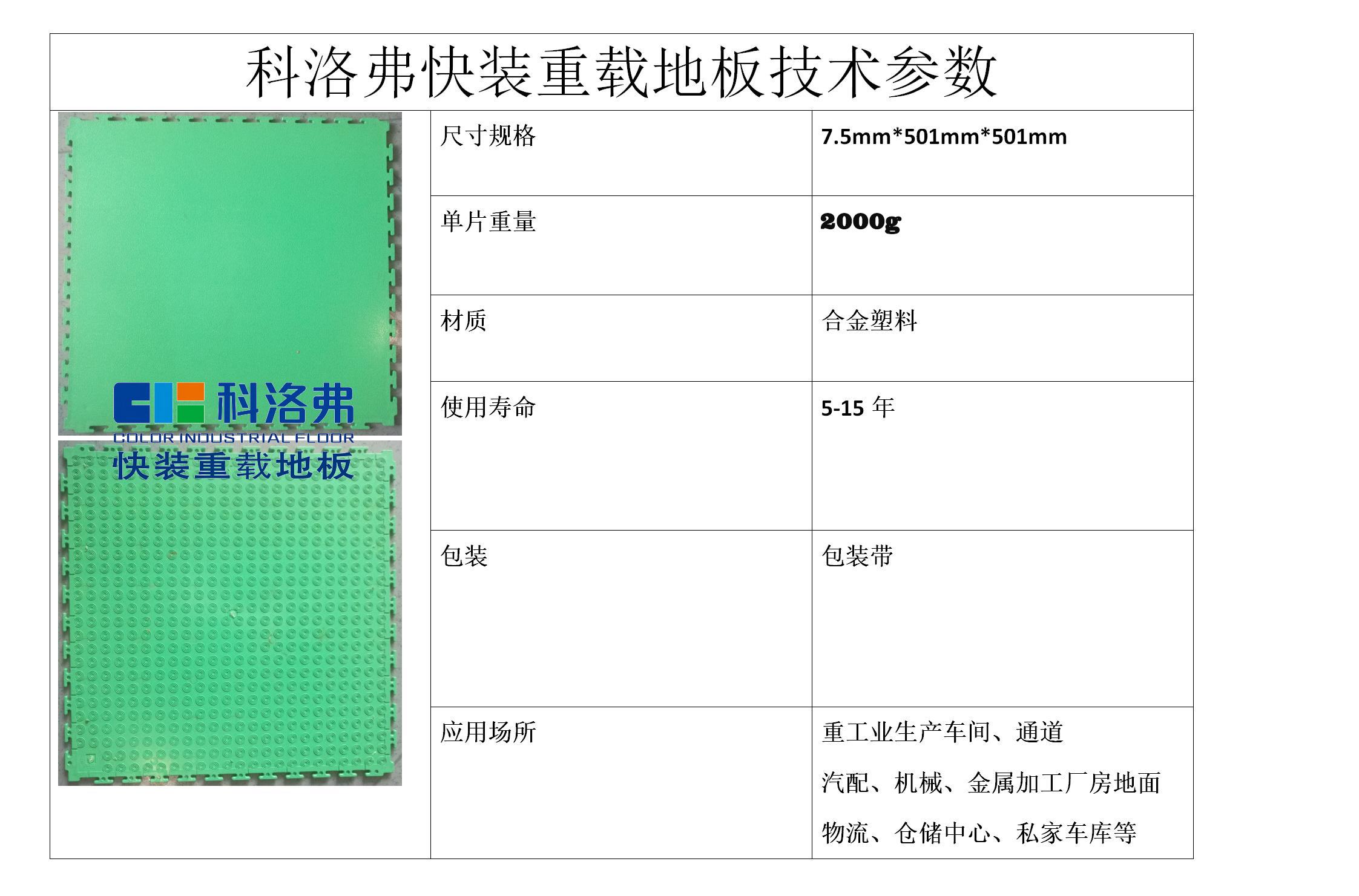 其它同類產(chǎn)品均采用底背大面積大深度鏤空結(jié)構(gòu)以達(dá)到節(jié)省材料成本的目的,其實(shí)際實(shí)心平板厚度只有2-3mm左右,所以導(dǎo)致產(chǎn)品重量嚴(yán)重不足,每塊重量只有1.6KG左右。而科洛弗快裝重載地板采用的是通體實(shí)結(jié)構(gòu),底部紋路深度1mm,其余厚度均為實(shí)心結(jié)構(gòu),科洛弗快裝重載工業(yè)地板產(chǎn)品每塊重量達(dá)到2.0KG,真材實(shí)料為后期產(chǎn)品使用壽命提供堅(jiān)實(shí)保障。