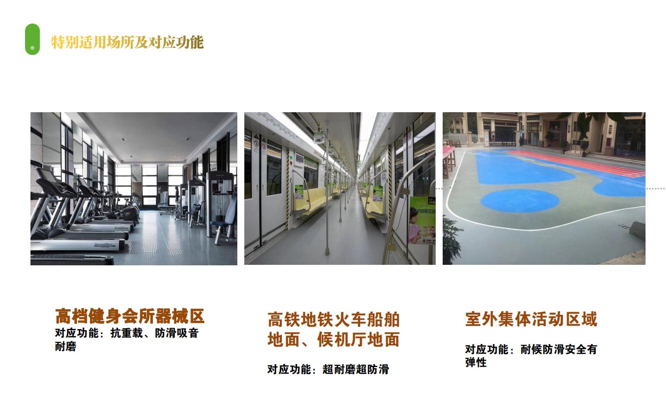 特別適用特點:1、超強防滑防摔性(360度雙重防滑專利設計、3.7mm實心高彈力納米材料結構),可防止摔倒時地面對人體產生的物理傷害。2、綠色環保,無毒無味且防霉抗菌,為老人小孩提供安全舒適的生活環境。3、超級耐磨,可保證15年以上的超長使用壽命。4、高回彈性保證了地面的高度舒適性,可減緩因行走而對人體產生的疲勞度。5、非發泡類地面材料,可支撐重物壓力,不影響輪椅推車通行,不產生壓痕